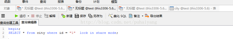 比如,我这里通过mysql打开两个查询编辑器,在其中开启一个事务,并不执行commit语句