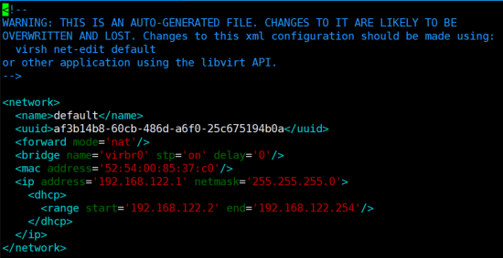 默认网络配置文件为:/etc/libvirt/qemu/networks/default.xml,其内容示例如下: