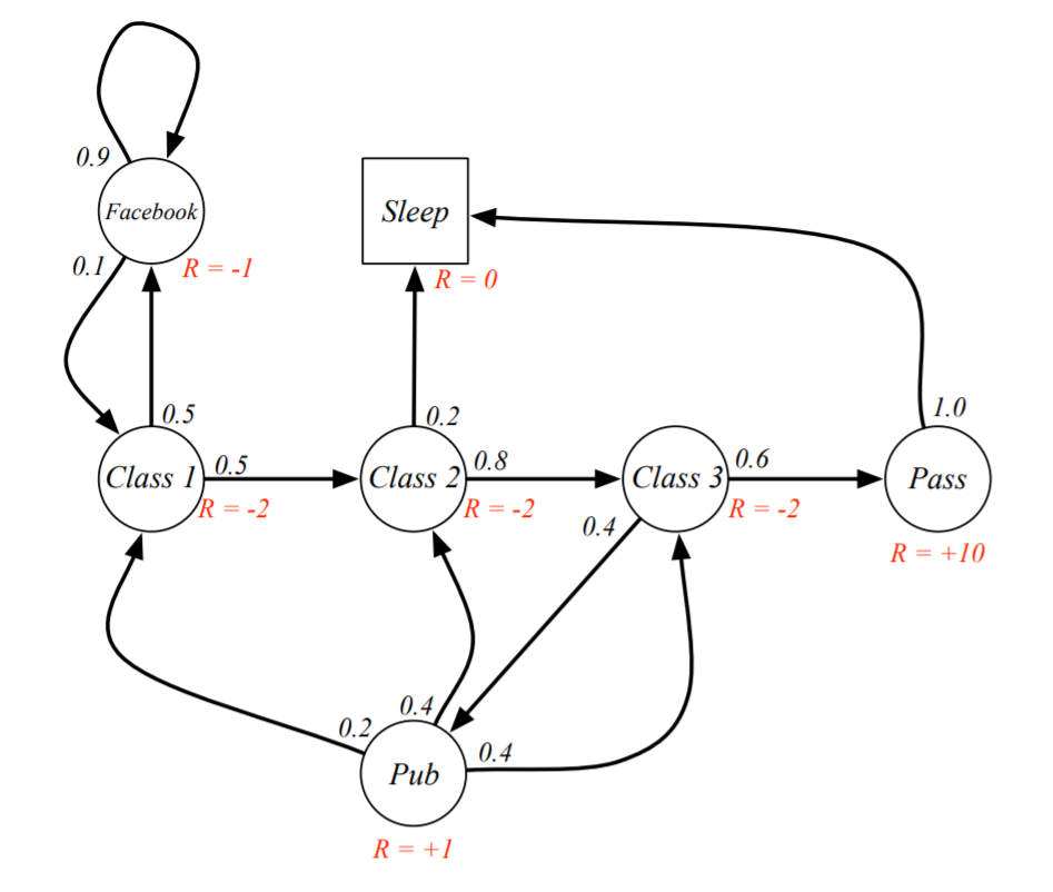 其状态转移过程举例如下:当一个学生在上class2时,他有20%的概率睡觉,80%的概率继续听class3.