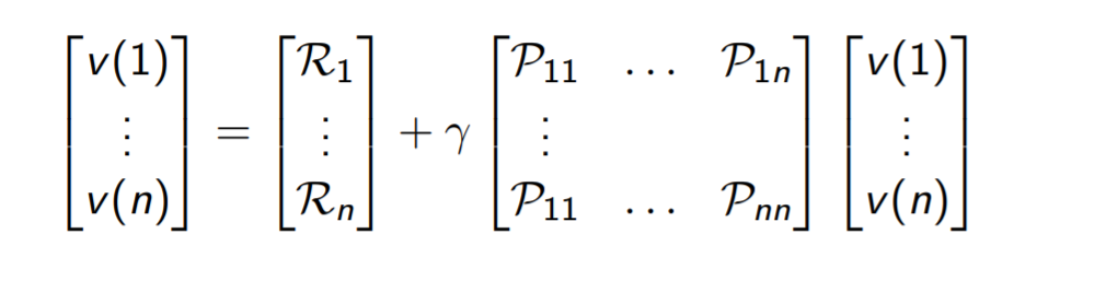 离散空间的Bellman方程整理得:\(v(s)=\mathcal{R}_{s}+\gamma \sum_{s^{\prime} \in \mathcal{S}} \mathcal{P}_{s s^{\prime}} v\left(s^{\prime}\right)\)