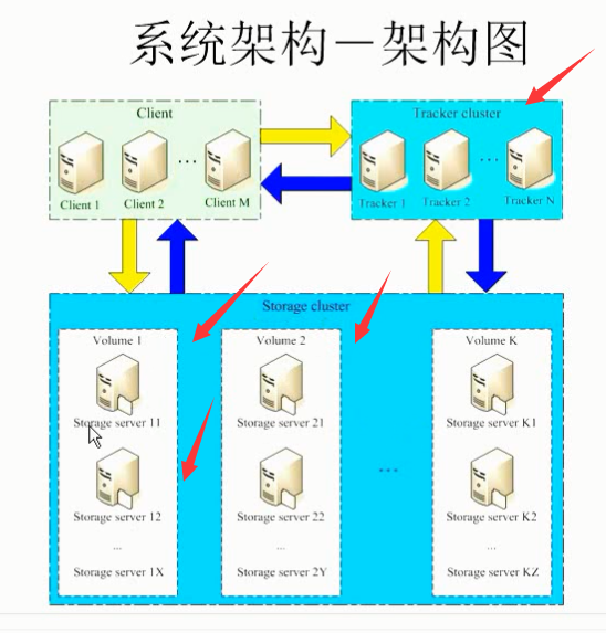 fastdfs主要由tracker(跟踪器)和storage(存储器)组成,tracker和storage都可以做集群,其中storage做集群时每个节点是一个组,节点间是横向扩容关系,而每个组里的多台服务器之间是主备关系。