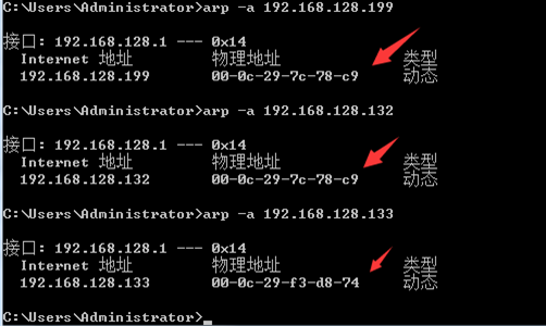 windows客户端使用arp -a 192.168.128.199可以查看该ip对应mac地址:
