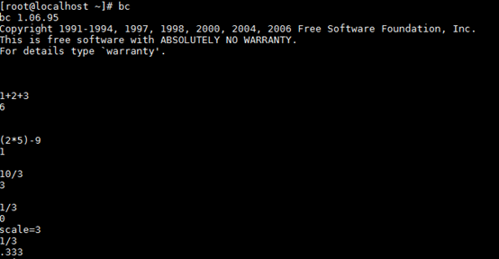 输入bc即可进入计算器,其实是打开了bc这个软件,类似vi。