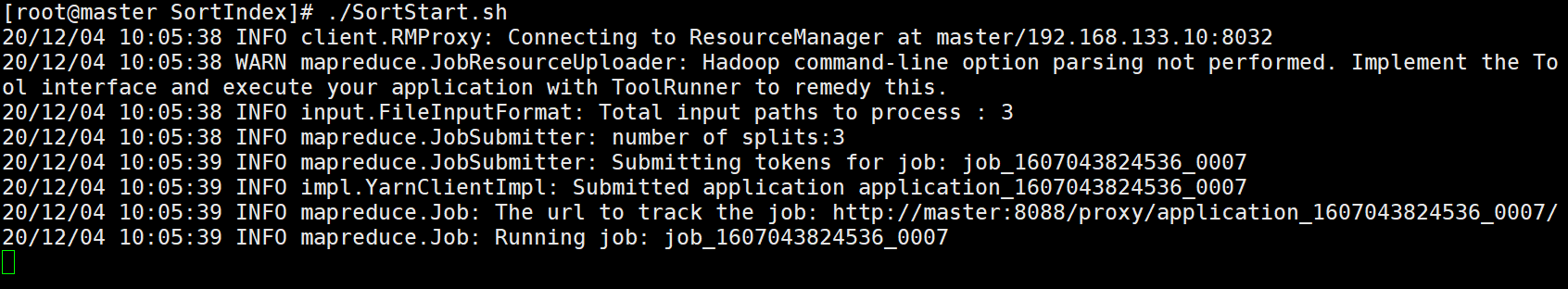 package Sort; import java.io.IOException; import java.net.URI; import org.apache.hadoop.conf.Configuration; import org.apache.hadoop.fs.FileSystem; import org.apache.hadoop.fs.Path; import org.apache.hadoop.io.Text; import org.apache.hadoop.mapreduce.Job; import org.apache.hadoop.mapreduce.lib.input.FileInputFormat; import org.apache.hadoop.mapreduce.lib.output.FileOutputFormat; public class SortMain { public static void main(String[] args) throws IOException, Exception { Configuration conf = new Configuration(); Job job = Job.getInstance(conf, "Sort Index"); if(args.length != 2) { System.err.println("两个参数 <input> <output>"); System.exit(2); } final FileSystem fileSystem = FileSystem.get(new URI(args[0]), conf); if(fileSystem.exists(new Path(args[1]))) fileSystem.delete(new Path(args[1]), true); job.setJarByClass(SortMain.class); job.setMapperClass(SortMapper.class); job.setMapOutputKeyClass(Text.class); job.setMapOutputValueClass(Text.class); job.setPartitionerClass(SortPartitioner.class); job.setNumReduceTasks(3); job.setReducerClass(SortReducer.class); job.setOutputKeyClass(Text.class); job.setOutputValueClass(Text.class); FileInputFormat.setInputPaths(job, new Path(args[0])); FileOutputFormat.setOutputPath(job, new Path(args[1])); job.waitForCompletion(true); } }