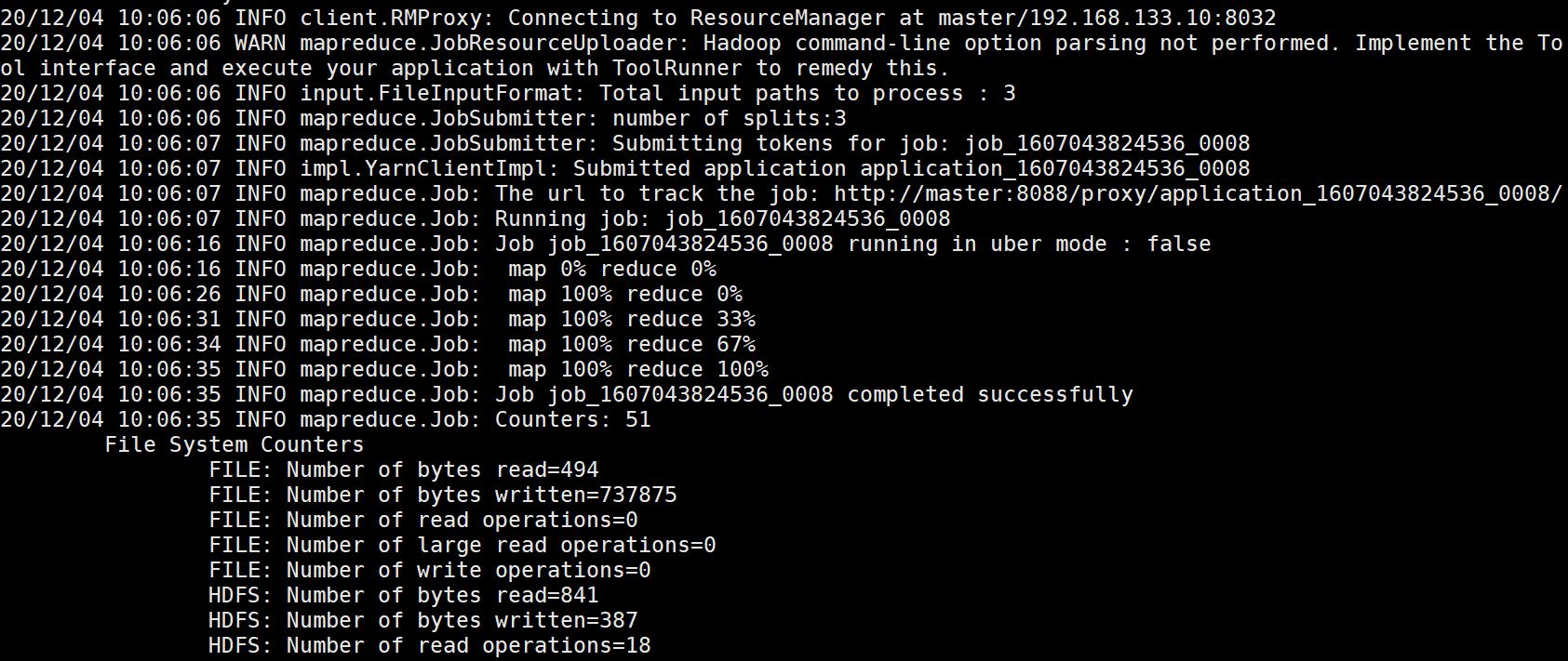 1 package WordCount; 2 3 import java.io.IOException; 4 import java.net.URI; 5 6 import org.apache.hadoop.conf.Configuration; 7 import org.apache.hadoop.fs.FileSystem; 8 import org.apache.hadoop.fs.Path; 9 import org.apache.hadoop.io.IntWritable; 10 import org.apache.hadoop.io.Text; 11 import org.apache.hadoop.mapreduce.Job; 12 import org.apache.hadoop.mapreduce.lib.input.FileInputFormat; 13 import org.apache.hadoop.mapreduce.lib.output.FileOutputFormat; 14 15 public class MainClass { 16 public static void main(String[] args) throws IOException, Exception { 17 Configuration conf = new Configuration(); 18 Job job = Job.getInstance(conf, "Word Count"); 19 20 if(args.length != 2) { 21 System.err.println("两个参数 <input> <output>"); 22 System.exit(2); 23 } 24 25 final FileSystem fileSystem = FileSystem.get(new URI(args[0]), conf); 26 if(fileSystem.exists(new Path(args[1]))) 27 fileSystem.delete(new Path(args[1]), true); 28 29 job.setJarByClass(MainClass.class); 30 31 job.setMapperClass(WCMapper.class); 32 job.setMapOutputKeyClass(Text.class); 33 job.setMapOutputValueClass(IntWritable.class); 34 35 job.setCombinerClass(WCReducer.class); 36 37 job.setPartitionerClass(WCPartitioner.class); 38 job.setNumReduceTasks(3); 39 40 job.setReducerClass(WCReducer.class); 41 job.setOutputKeyClass(Text.class); 42 job.setOutputValueClass(IntWritable.class); 43 44 FileInputFormat.setInputPaths(job, new Path(args[0])); 45 FileOutputFormat.setOutputPath(job, new Path(args[1])); 46 47 job.waitForCompletion(true); 48 } 49 }