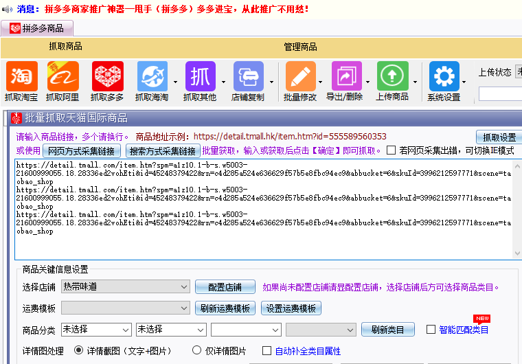 不过商家在入驻之后就会想一些问题,怎么抓取海淘商品上传到拼多多,某猫平台也是有某猫国际的,这些商家估计也在某猫开国际店,那么一键抓取商品搬家到拼多多海淘店呢?还有就是一些代发商要怎么做海淘店呢?怎么抓取商品批量上传到拼多多海淘店呢?这个目前是拼多多商家入驻多多国际的一个难题,入驻成功不知道怎么上传商品是比较郁闷的事情啦。
