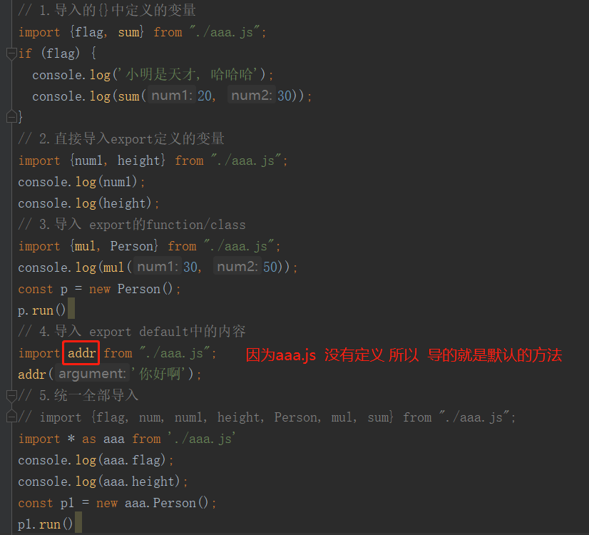 var name = '小明' var age = 18 var flag = true function sum(num1, num2) { return num1 + num2 } if (flag) { console.log(sum(20, 30)); } // 1.导出方式一: export { flag, sum } // 2.导出方式二: export var num1 = 1000; export var height = 1.88 // 3.导出函数/类 export function mul(num1, num2) { return num1 * num2 } export class Person { run() { console.log('在奔跑'); } } // 5.export default // const address = '北京市' // export { // address // } // export const address = '北京市' // const address = '北京市' // export default address export default function (argument) { console.log(argument); }