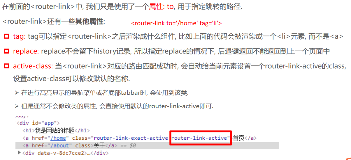 上面代码的 作用是 ,将router-link标签渲染的<a>标签 转成 button按钮 将actice-class替换成active