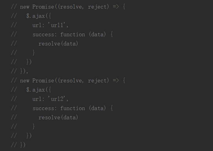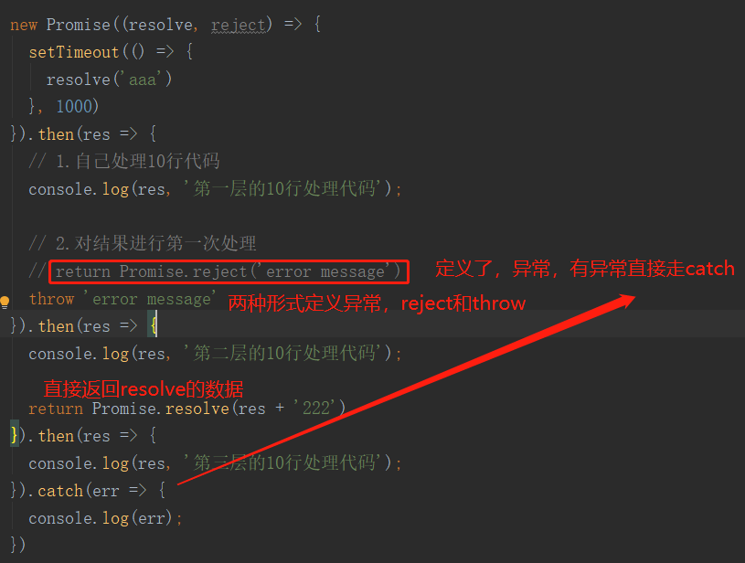 // 网络请求: aaa -> 自己处理(10行) // 处理: aaa111 -> 自己处理(10行) // 处理: aaa111222 -> 自己处理 new Promise((resolve, reject) => { setTimeout(() => { resolve('aaa') }, 1000) }).then(res => { // 1.自己处理10行代码 console.log(res, '第一层的10行处理代码'); // 2.对结果进行第一次处理 return new Promise((resolve, reject) => { resolve(res + '111') reject('err') }) }).then(res => { console.log(res, '第二层的10行处理代码'); return new Promise(resolve => { resolve(res + '222') }) }).then(res => { console.log(res, '第三层的10行处理代码'); }).catch(err => { console.log(err); })