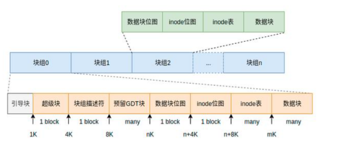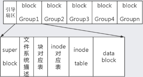 因为一个分区可能很大,可能会分成很多很多个block,为了便于管理,系统将这些block分成多个block组,每个block组中存储当前组的信息和当前block组的block,如下图: