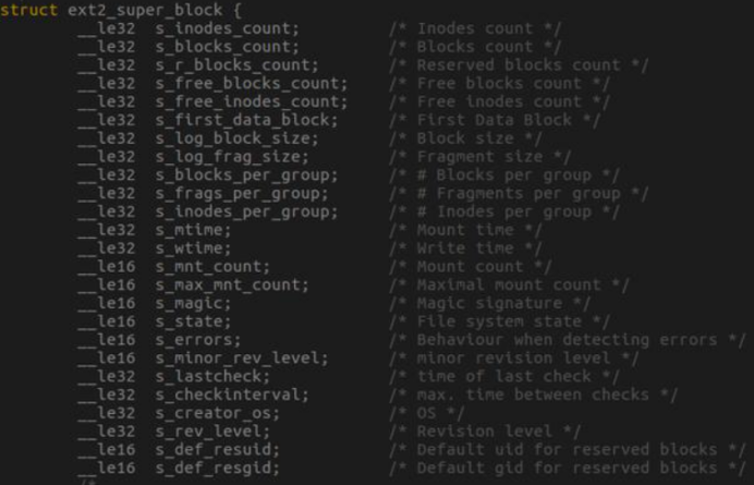 EXT2文件系统自然也不例外,在该文件系统开头的地方也有一个超级块,具体如图所示。EXT2文件系统的超级块位于磁盘开始偏移1kb的地方,其尾部却与4kb对齐。