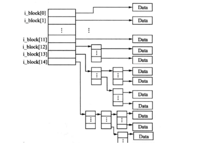 i_block[]共有15项,其中前12项为直接指向文件数据块的指针,后3项分别为采用多级索引结构的“一次间接指针”、“二次间接指针”和“三次间接指针”。其作用与内存管理中的多级页表类似,便于大型文件的存储处理。