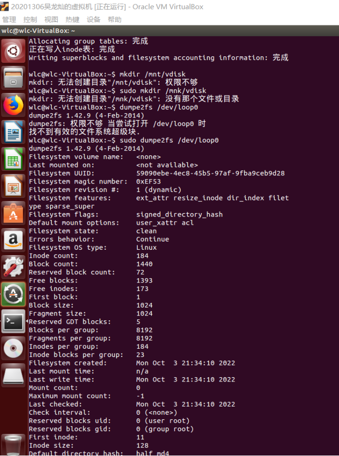 wlc@wlc-VirtualBox:~$ dumpe2fs /dev/loop0通过此命令实现: