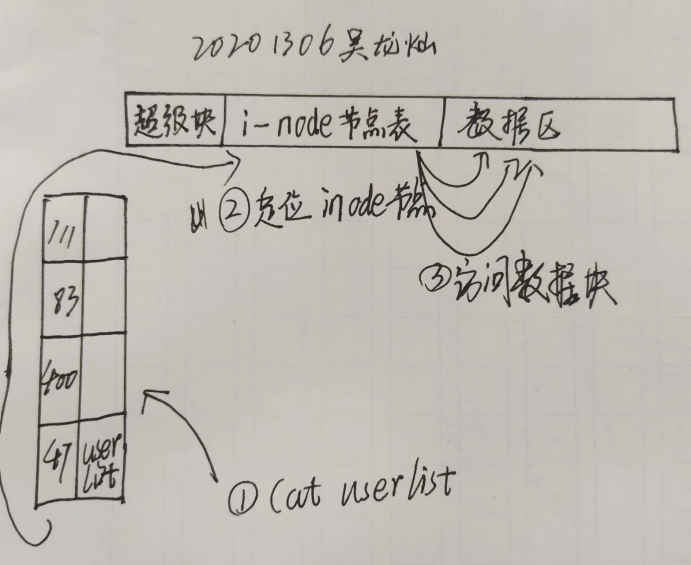 写出Cat userlist的过程,要详述目录文件,i-node.数据块,要画图示意