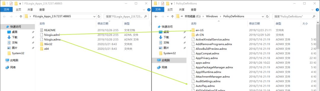- 启用 FSLogix 不需要安装任何独立的管理服务器,只需要通过AD组策略编辑一组策略即可使FSLogix Profile生效 ;FSLogix在安装包中提供了ADM Templates,只需将ADM Templates文件拷贝到Dmoain Controller服务器即可;从FSLogix安装包中提取“fslogix.adml”、“fslogix.admx”两个文件,将fslogix.adml文件复制到Dmoain Controller服务器的C:\Windows\PolicyDefinitions\en-US 文件夹中;将fslogix.admx文件复制到Dmoain Controller服务器的C:\Windows\PolicyDefinitions\ 文件夹中;