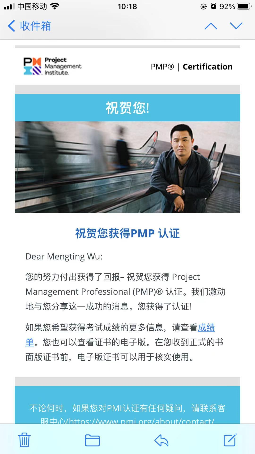 6月20日,考完了PMP认证考试,直到7月27日 凌晨5点的时候 发邮件给我了,让我在梦中醒来.我知道 这一次考试我确实是比较在意的,毕竟花了 重金去试的, 考完后我也挺害怕的 考完心里特别没谱,于是就好像回到了曾经上学考试的时候,好久没有这种感觉了.我还挺回味.到后来我都忘记了这个事情,到7月27发邮件给我 我就有点惊喜了. 我也没有花重金去报培训班,自学也是从5月开始的,每天白天有空就看视频,视频真的好多,不管从哔哩哔哩 还是在博客上看到前人的经验,买了几本试题,我喜欢纸质的,这样做起来有感觉.所以也没有特别去努力做,也没有强硬要求自己一定要达到某种程度,自己测试题目达到130 就很心满意足了的结束了当天的学习.但必须每学一节,就要做题测试一下自己理解的范围. 融会贯通,然后我是拿了平板去每天做pmp项目管理助手,这个APP 很不错,题目跟考试题有几题一样.闲的时候就可以做.也会让自己有成就感.. 希望它对以后的工作有帮助.毕竟我也是女程序媛一枚!