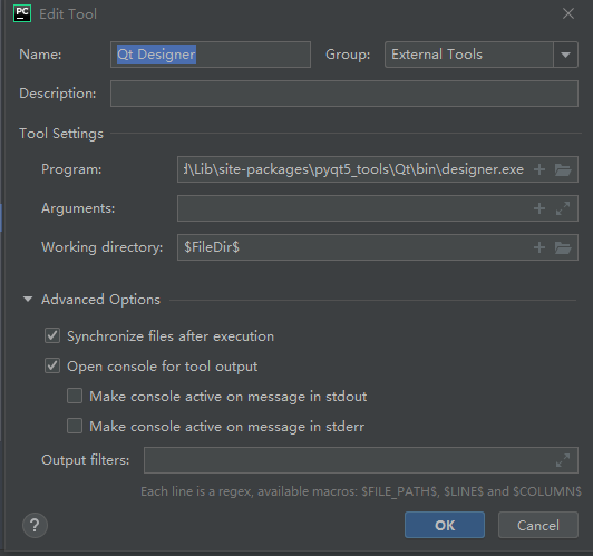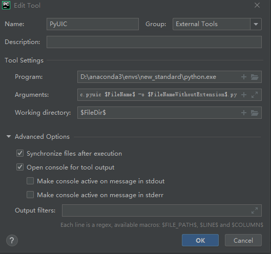 - Arguments:-m PyQt5.uic.pyuic \(FileName\) -o \(FileNameWithoutExtension\).py