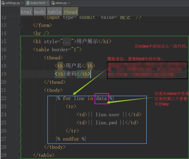这时候,django采用自己的模板语言,类似jinja2,根据提供的数据,替换掉html中的相应部分,详细语法入门后再深入学习。