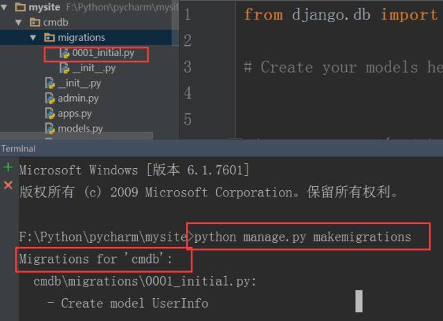 接下来要在pycharm的teminal中通过命令创建数据库的表了。有2条命令,分别是: