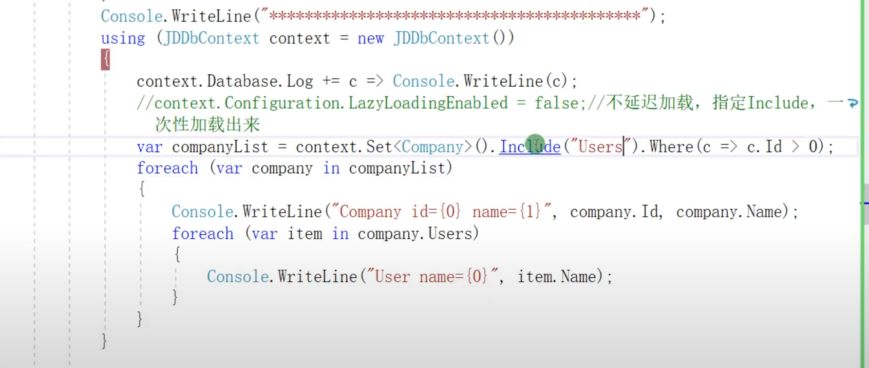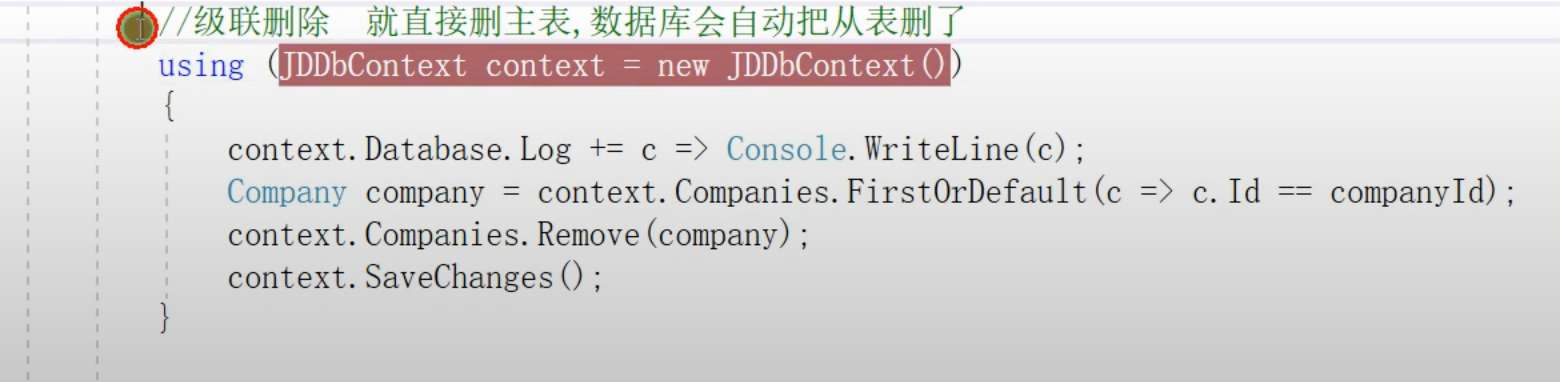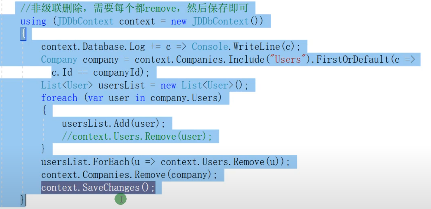 非级联删除(首先从数据库获取数据,保存到缓冲当中,然后在缓存中将数据删除,因为使用Remove删除数据,相当于在缓存中将数据删除了,Company中的Users数据已经被删除,此时再进行context的提交才能将数据删除掉)