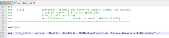 在catalina.bat中追加环境变量 set java_opts= -server -Xms40m -Xmx1024m -XX:MaxPermSize=512m -Djava.library.path=E:\dmdbms\bin;
