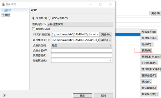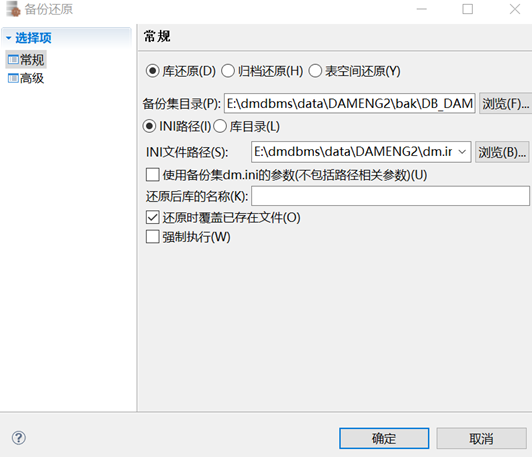 a、选择备份文件,点击还原,选择dm.ini路径勾选还原时覆盖已存在的文件