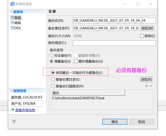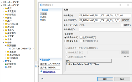 b、新建备份。指定dm.ini其他各个选项默认即可,这样备份文件会创建在指定的dm.ini所对应的数据库的bak文件夹下。