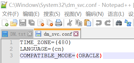 第二步:系统目录下添加dm_svc.conf配置文件,文件中添加全局配置COMPATIBLE_MODE=(ORACLE)。