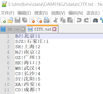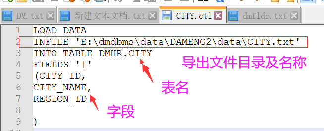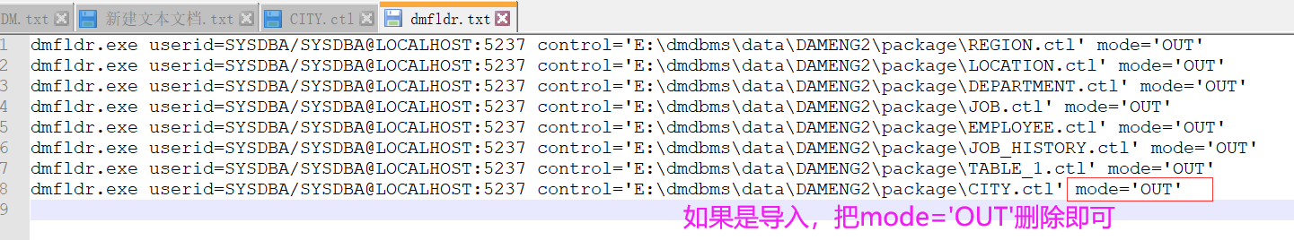 1、创建导入脚本exeintotable.bat,并把E:\dmdbms\data\DAMENG2\package\dmfldr.txt文件中的执行语句copy到执行脚本中,把mode='OUT'删除即可。或者直接复制黏贴导出脚本再删除mode='OUT'。