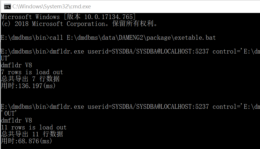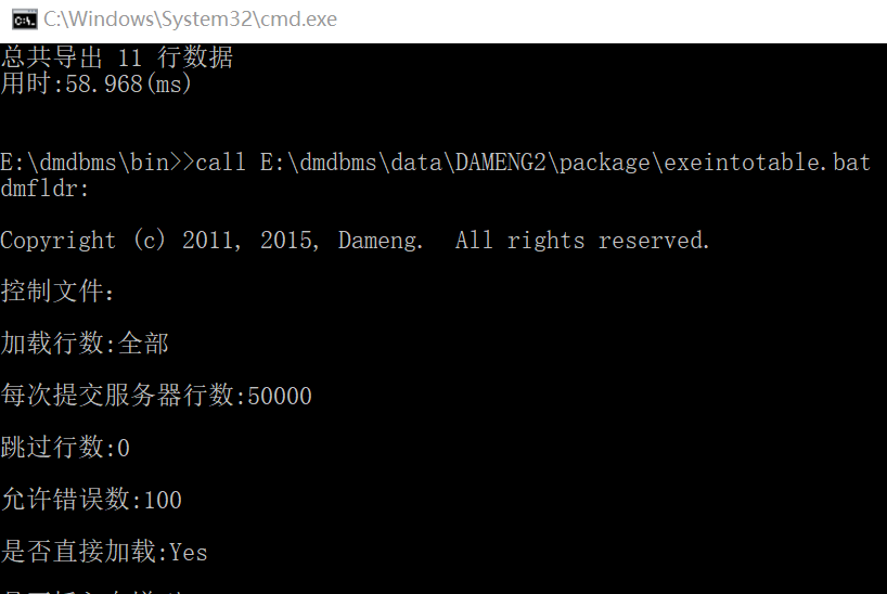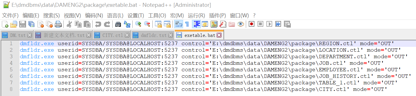 1、创建导出脚本exetable.bat,并把E:\dmdbms\data\DAMENG2\package\dmfldr.txt文件中的执行语句copy到执行脚本中。