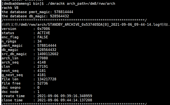 [dmdba@dameng1 bin]$ ./dmrachk arch_path=/dm8/rww/arch