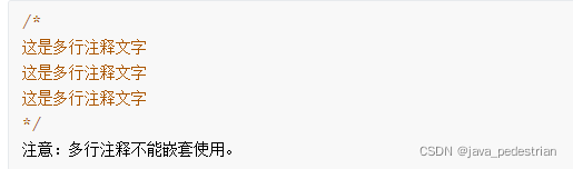 - 多行注释 :多行注释的格式是使用/* 和 */将一段较长的注释括起来。多行注释里面不允许有多行注释嵌套。