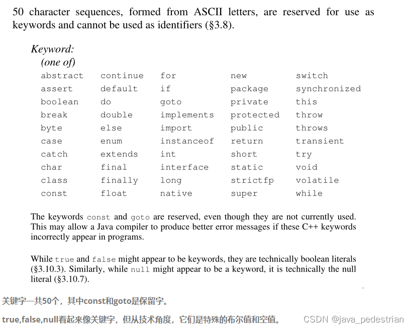 - 关键字的特点:全部都是小写字母。