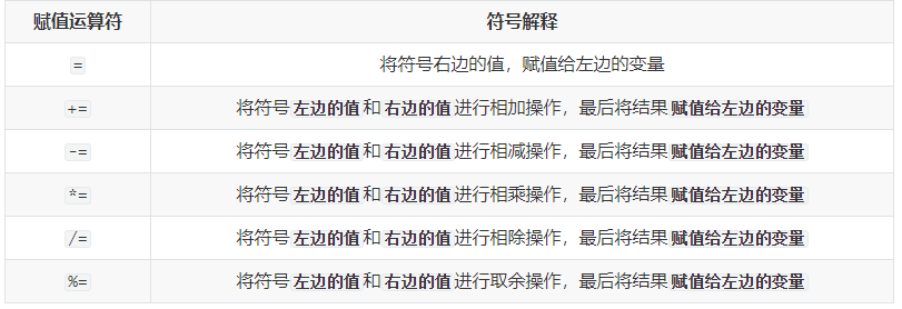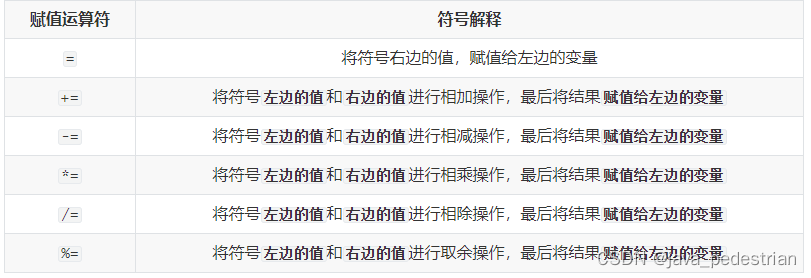- 赋值运算符,就是将符号右边的值,赋给左边的变量。 所有的赋值运算符的左边一定是一个变量,不能是常量。