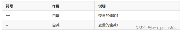 ++ 运算,变量自己的值加1。反之,-- 运算,变量自己的值减少1,用法与++ 一致。只能操作变量,不能操作常量