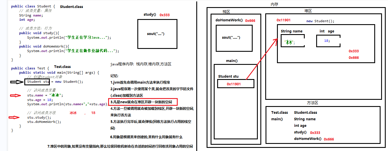 package com.wrg.demo04; public class Student { // 成员变量: 属性 String name; int age; // 成员方法: 行为 public void study(){ System.out.println("学生正在学习Java..."); } public void doHomeWork(){ System.out.println("学生正在做作业敲代码..."); } } class Test { public static void main(String[] args) { // 创建Student对象 Student stu = new Student(); //直接打印对象名,就是输出他的内存地址值 System.out.println(stu);// com.wrg.demo04.Student@4554617c // 访问成员变量 stu.name = "冰冰"; stu.age = 18; System.out.println(stu.name+","+stu.age); // 访问成员方法 stu.study(); stu.doHomeWork(); } }