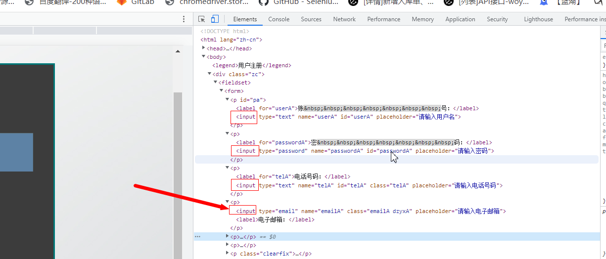 示例:通过input标签定位邮箱输入框(邮箱的input标签是 页面的第四个,所以下标是3)