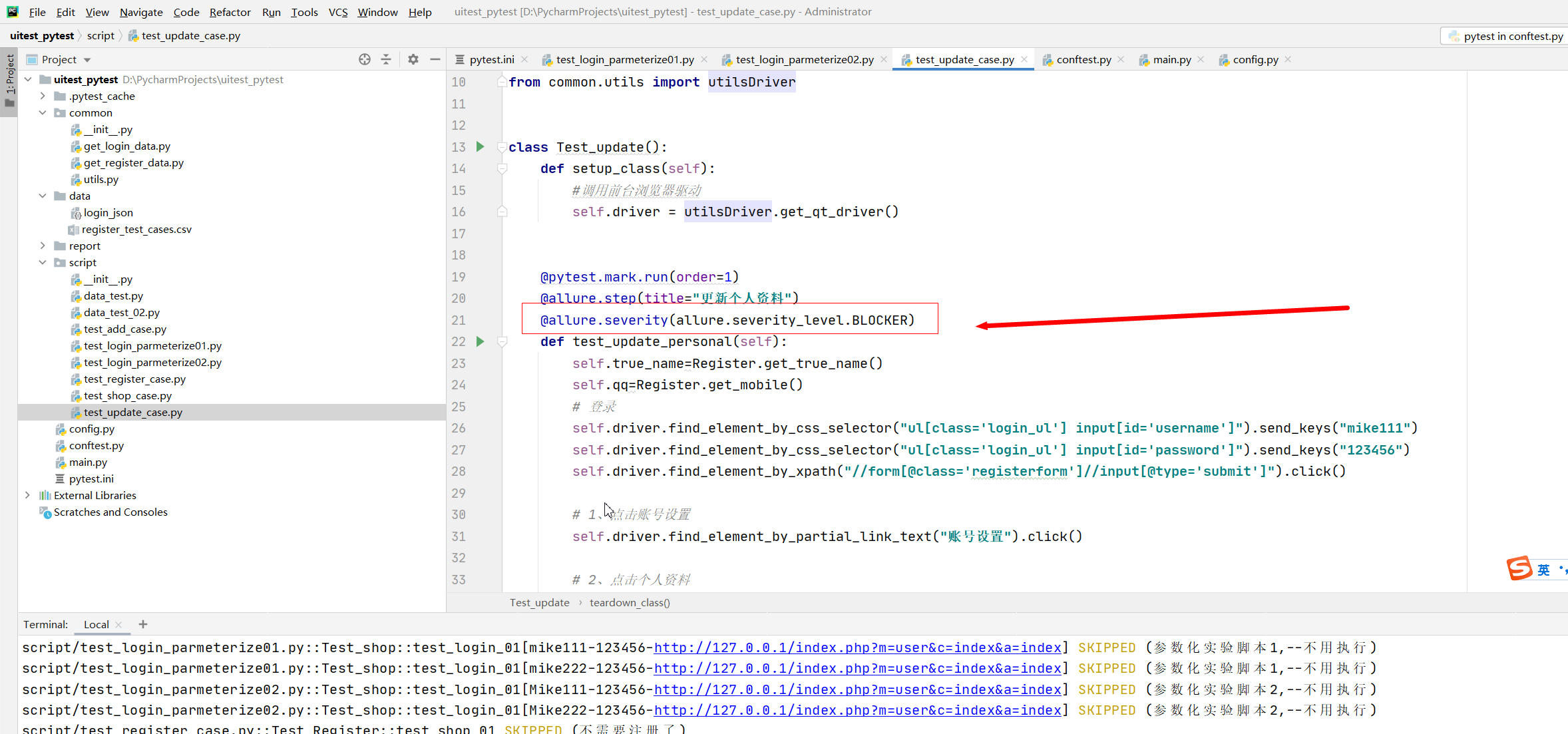 在测试脚本中,增加装饰器 @allure.severity(allure.severity_level.BLOCKER)
