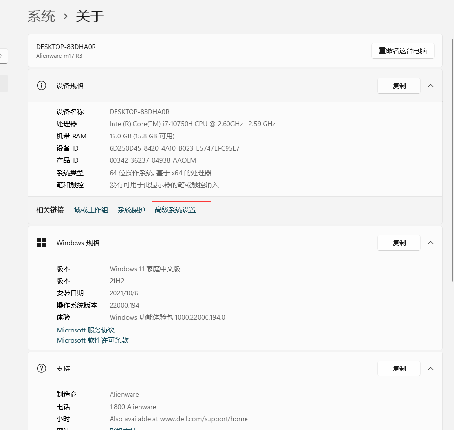然后打开桌面我的电脑属性 进入高级设置 我这是win11系统可能和其他版本不一样