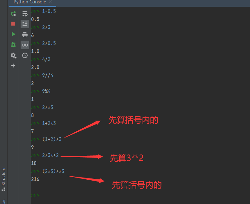 •混合运算优先级顺序:()高于**高于*,/,//,+,-