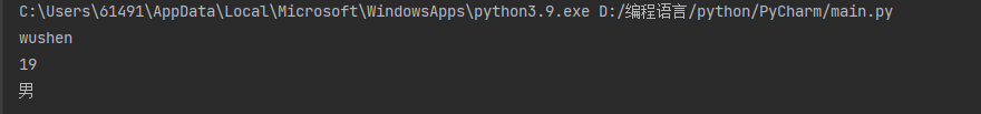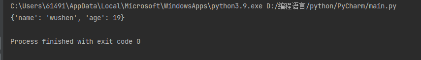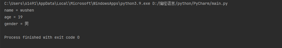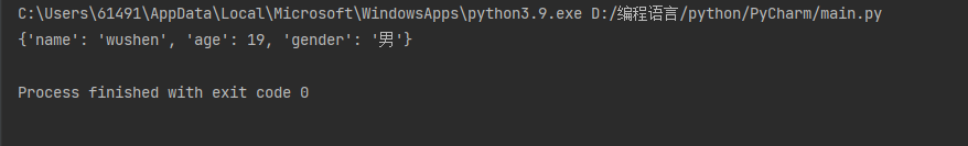 # 结果:{'name': 'wushen', 'age': 19, 'gender': '男'}