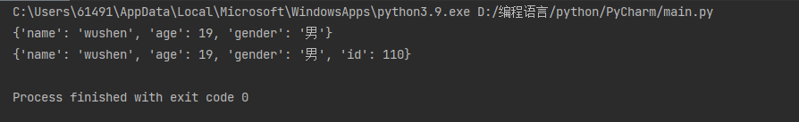 # {'name': 'wushen', 'age': 19, 'gender': '男', 'id': 110}