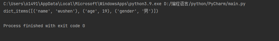 print(dict1.items()) # dict_items([('name', 'wushen'), ('age', 19), ('gender','男')])