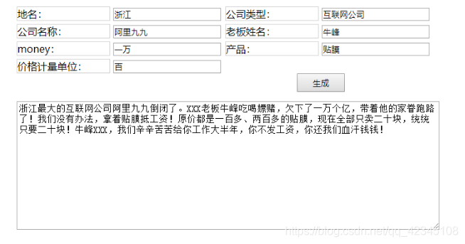 str=adress+"最大的"+type+company+"倒闭了。XXX老板"+name+"吃喝嫖赌,欠下"+money+"个亿,带着他的家眷跑路了!我们没有办法,拿着"+production+"抵工资!原价都是一"+unit+"多、两"+unit+"百多的"+production+",现在全部只卖二十块,统统只要二十块!"+name+"XXX,我们辛辛苦苦给你工作大半年,你不发工资,你还我们血汗钱钱!"