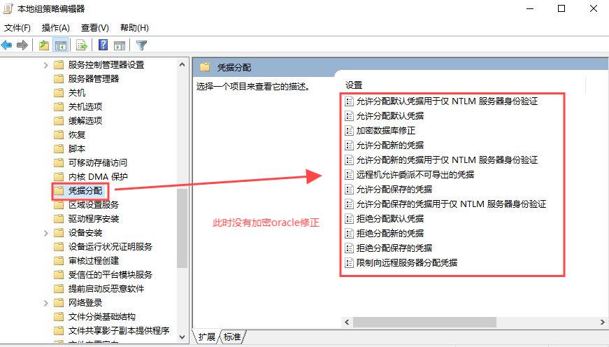 运行-->gpedit.msc-->本地组策略编辑器-->计算机配置-->管理模板-->系统-->凭据分配-->加密oracle修正。