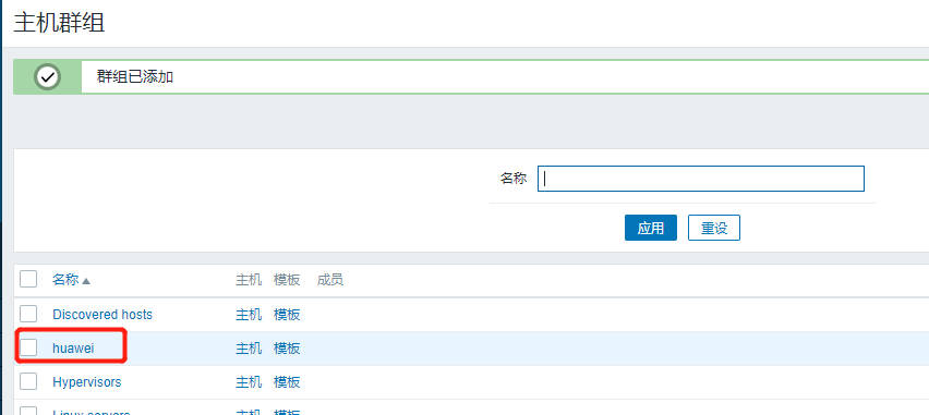 在配置——主机群组——右上角创建主机群组中,创建一个名称,建议按照服务的类型来命名,这次我们使用huawei来命名: