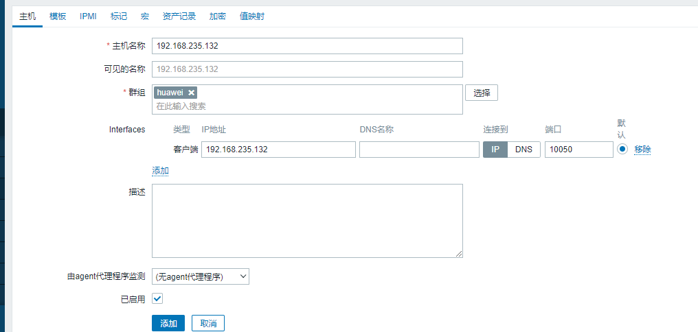 2、配置主机监控:在配置——主机——右上角创建主机中,添加一台主机,主机名称建议也按照业务命名,此处我们命名为192.168.235.132,选择群组为刚刚创建的huawei