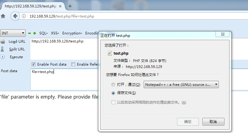 对文件逐一进行测试,发现test.php页面可能存在文件包含或文件下载