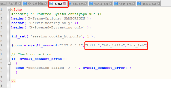 对上面扫描出的文件逐一下载审计,发现c.php文件是数据库连接脚本,发现数据库账号和密码