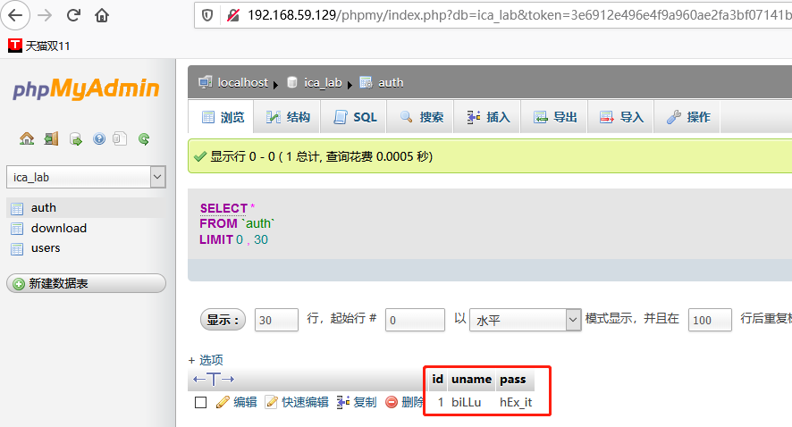 输入上面c.php爆露的账号和密码,进入数据库,得到web登陆账号和密码